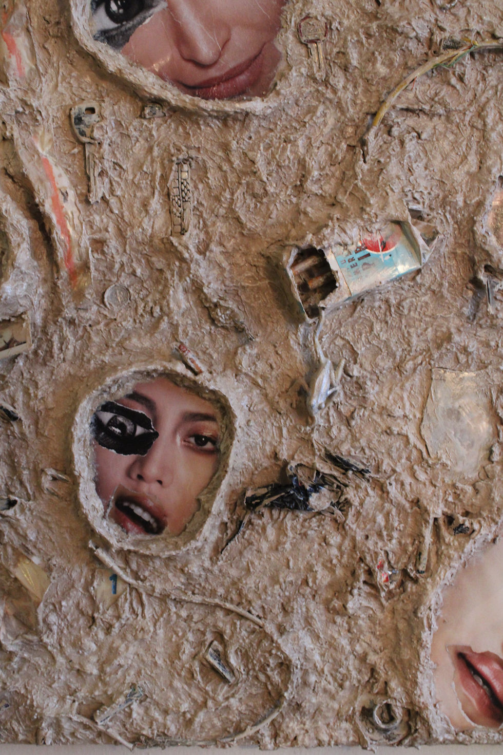 "the breathing and the buried, series VII" - 40 x 48" - collage on canvas, joint compound and found objects, 2024
