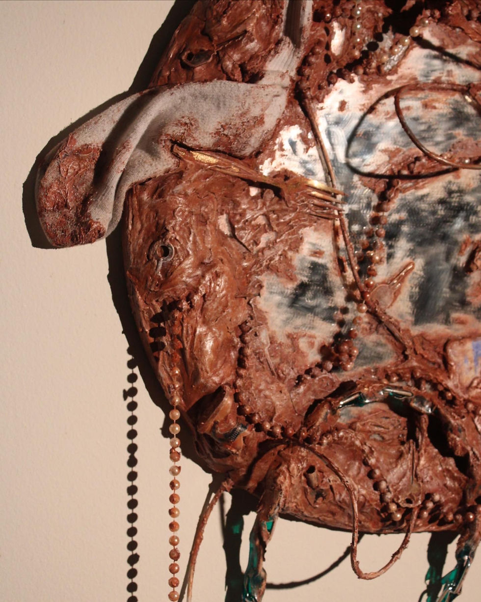 "the breathing the buried, series VI" - 29 x 30" - joint compound, found objects and acrylic on mirror, 2023